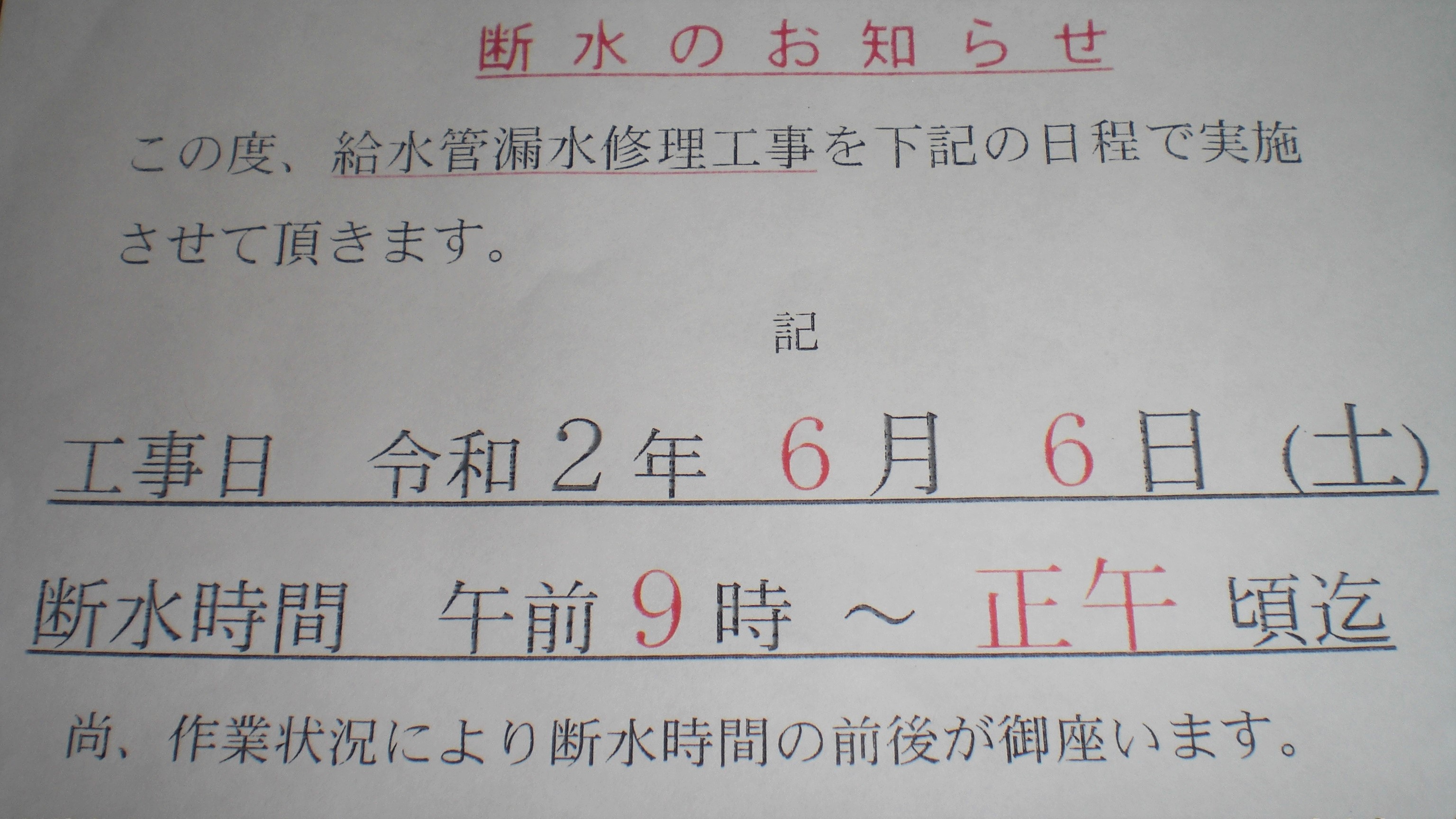 6/6(土)断水のお知らせ!