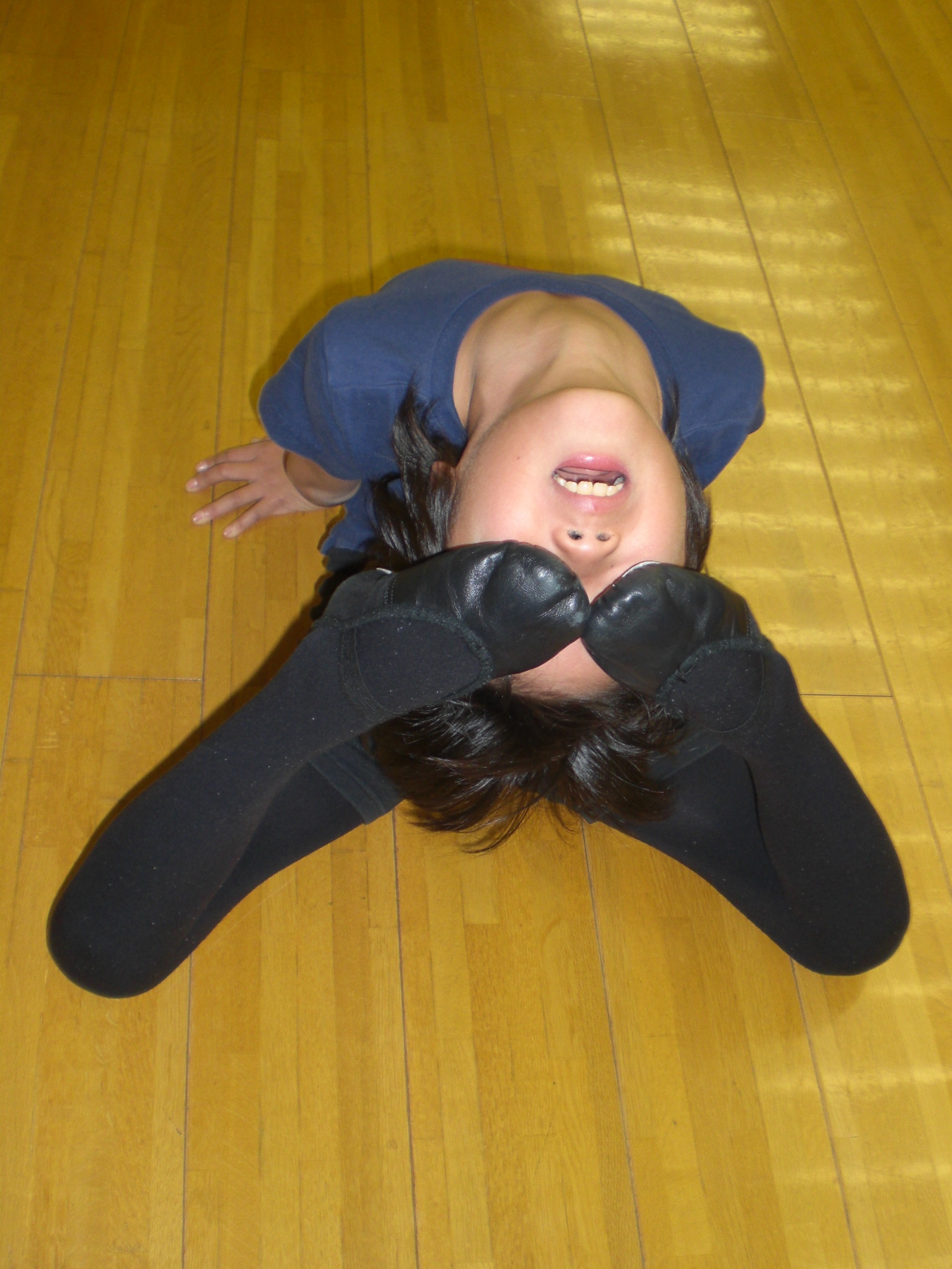 背筋のストレッチですが、 おでこついたら眼!!! と先生が仰りましたが・・・ え~・・・ 両目サングラスですか(O_o)WAO!!! はりきって見せて下さいました☆ 素晴らしい~(^ヘ^)v